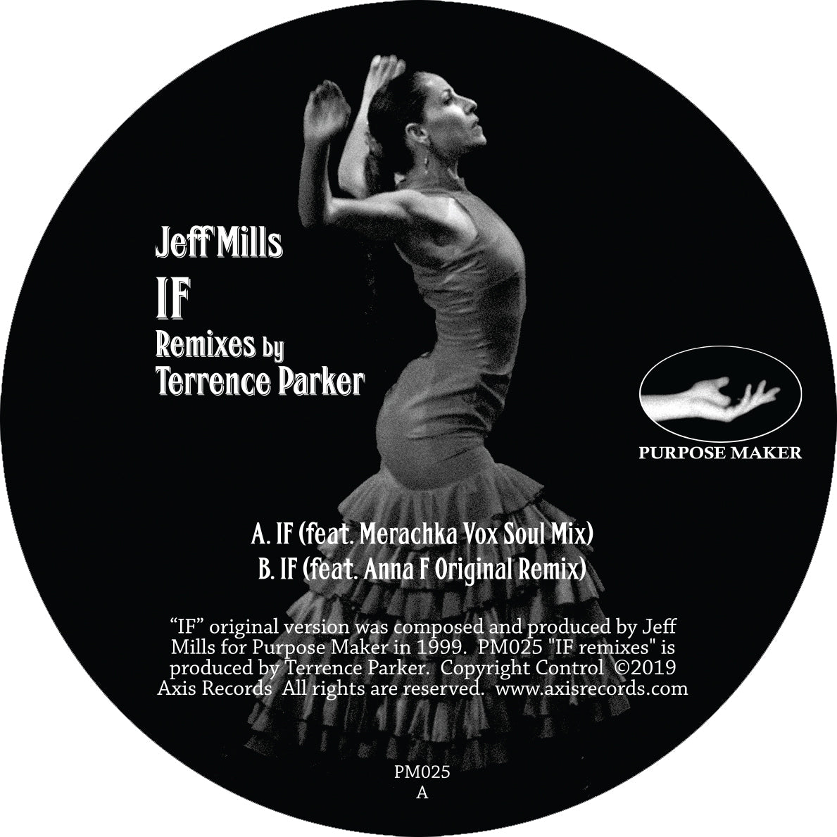 Credit:  “If” original version was composed and produced by Jeff Mills for Purpose Maker in 1999.  PM025 “If – Remixes” is produced by Terrence Parker. Mastered by Steve Kovacs. Copyright Control. ©2019 Axis Records.  All rights are reserved.